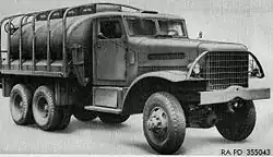 Wanting a fuel tanker larger than the CCKW, the Army ordered 25 from White. The body had 4 self-sealing tank compartments for a total of 2,000 US gal (7,600 L). A bow and canvas top was fitted, so the truck could be disguised as a common cargo truck. Early trucks had a hard cab and a front-mounted pintle hitch, later trucks had an open cab and a 25,000 lb (11,000 kg) front winch. A 2,000 US gal (7,600 L) gallon trailer could be towed. No follow up orders were made.[6][19]