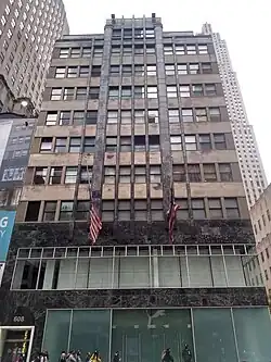 The house and adjacent art gallery were demolished in March 1930.[29][30] Plans for a commercial building were filed with the New York City Department of Buildings the same month.[31] By that May, Goelet was still deciding between two different plans for a 15-story building. Though both options included office space above a two-story retail area, only one of the options provided space for a showroom.[32] In November 1930, the East River Savings Bank gave Goelet a $1 million mortgage for the project.[33][34] The plans for the current 10-story commercial building were announced the next month.[3] At the beginning of 1931, Fifth Avenue was experiencing high demand for storefront space, with only 12 of 224 stores being unoccupied. 608 Fifth Avenue, along with 500 Fifth Avenue and the Empire State Building, were expected to add a combined 11 stores.[35][36] In June 1930, Robert Walton Goelet hosted a ceremony to give craftsmanship awards to 23 workers who were involved in the project.[37]