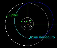 The orbit of 6144 Kondojiro compared to that of Jupiter and the inner planets