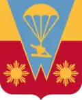 - Shield: Per fess enhanced Or and Gules, on a pile of two points Azure (Korean service ribbon Blue) fimbriated at the first between in base two Philippine suns of the like, a howitzer mounted on a heavy drop platform and attached to an open parachute all of the last.