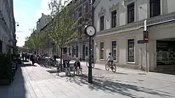 On 2 April 2014, work began on transforming the oldest section of 6 Sierpnia Street – between Piotrkowska Street and Tadeusz Kościuszko Avenue – into a woonerf, an urban courtyard inspired by urban planning solutions used in countries such as the Netherlands. The term woonerf was borrowed from Dutch by the proponents from the Normal City – Phenomenon Foundation and used for the first time in Łódź and Poland to refer to this type of urban space arrangement.[80][81][82] The renovation included replacing the asphalt surface with pavers and granite slabs, installing flowerbeds, benches, bicycle racks, an ornamental street clock, and planting five Kanzan cherry trees imported from Germany along the street. Additionally, parking spaces were designated, and this section was made a traffic-calmed zone. The work lasted two and a half months, and the courtyard was officially opened on June 28. The transformation, proposed by Bartłomiej Derdzikowski,[k][83] was carried out despite opposition from the City Architect of Łódź, Marek Janiak, the Łódź District Chamber of Architects of the Republic of Poland,[84] and the Łódź branch of the Polish Urbanists Association, as part of the first edition of the Łódź civic budget, at a cost of 1.4 million PLN.[81][85][86][87] The same Polish Urbanists Association branch awarded a special prize on 11 May 2015 for the revaluation of Piotrkowska and 6 Sierpnia streets in Łódź in the 11th edition of its competition for the best-developed public space in the Łódź Voivodeship.[88] Earlier, on 21 April 2015, the courtyard received an award for the best civic budget project in Poland, granted by the Municipal Portal I Live Here! – Smart Ideas for a Smart City at the VII European Economic Congress in Katowice.[83][89]