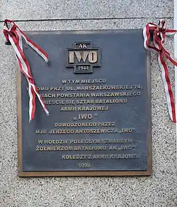 In 1998, on its front wall was placed a plaque commemorating the location of the headquarters of the Iwo Battalion of the Home Army, which operated in Pod Husarzem Tenement in 1944, during the Warsaw Uprising, in the Second World War.[4]