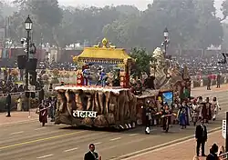 The Indian Navy contingent comprised 144 Agniveers, both male and female, led by Lieutenant Prajwal M. Platoon commanders included Lieutenant Mudita Goyal, Lieutenant Sharvani Supreiya, and Lieutenant Devika H.[14] The Navy's tableau, themed "Nari Shakti" and "Sea Power Across the Oceans Through Indigenisation", depicted the aircraft carrier INS Vikrant, along with escort ships, submarines, and naval aviation assets.[15]
