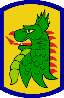 • Shoulder patch: An escutcheon with a red field and a blue chief, separated by an olive drab line; a three-pronged white device is superimposed on the blue chief.
