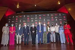 The nominations were announced on 19 July 2021 from the Madrid Town Hall by actresses Belén Rueda and Paulina García, director Manolo Caro and presenter Elena Sánchez.[13][14] Miquel Iceta, Enrique Cerezo, Rebeca Grynspan, Marta Rivera, José Luis Martínez-Almeida and Adrián Solar also attended the event.[13] The "Ibero–American Hymn" composed by Lucas Vidal was presented at the event, commemorating the Day of Ibero–America (19 July).[15] Regarding the film section, the Colombian film Forgotten We'll Be and the Guatemalan film La llorona obtained the most nominations (11).[13][16] The Spanish series Patria was the television series with the most nominations (5).[16] The official poster was designed by Javier Mariscal.[17]