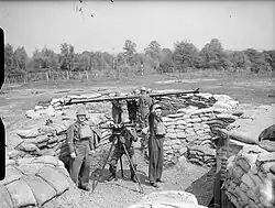 The vital port of Antwerp was the main 'Diver' target, and the number of V-1s launched against Brussels declined sharply after December.[33] In January the regiment was released from the 'X' defences and moved up to Helmond in the Netherlands. Despite bad weather and campsites, the regiment came into action on 9 January, with 303 HAA Bty firing in the ground role at Overloon. Over the following weeks the battery was engaged as medium artillery firing percussion-fused and airburst high explosive (HE) rounds in support of II Canadian Corps and VIII British Corps, sometimes carrying out several shoots a day against targets of opportunity. The intensity of this work increased on 8 February with the opening of First Canadian Army's offensive in the Reichswald (Operation Veritable) when the battery's 8 guns frequently fired over 1000 rounds per day.[34][35][36]