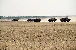 The AMX-10 RC is a French armoured fighting vehicle manufactured by Nexter Systems for armoured reconnaissance purposes. Equipping French cavalry units since 1979,[1] over 240 remained in service with the French Army in 2021 when replacement by EBRC Jaguar gradually started.[2] 108 units were sold to Morocco and 12 to Qatar. "RC" stands for "Roues-Canon", meaning "wheels-gun", as it is 6-wheeled and armed with a 105 mm calibre gun. Newspapers and officials[3] have often incorrectly[4] referred to it as a "char léger"[5] (light tank).[6][7]