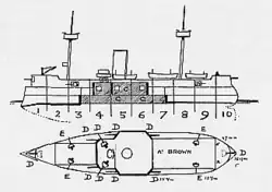 Almirante Brown was equipped with a main battery of eight 8-inch (203 mm) BLR Armstrong guns, all mounted individually in casemates. Six were in a central battery, and the other two were in the bow and stern as chase guns. The central battery was sponsoned out over the hull to position the guns such that four could fire directly ahead and two could fire astern.[4] These breech-loading guns were a new development, which rendered Almirante Brown a significantly more powerful vessel than even those that had been completed a few years earlier. The central battery was protected by heavy armor plate, but the chase guns were entirely unprotected, beyond the thin hull plating that enclosed their positions.[10] The guns fired a 180-pound (82 kg) shell, using a 90 lb (41 kg) propellant charge. These shells were capable of penetrating 16 in (410 mm) of wrought iron armor, which was the type of armor that protected most ironclads in service in foreign navies.[11]