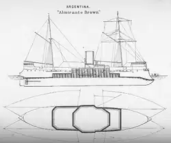 ARA Almirante Brown was a central battery ironclad of the Argentine Navy built in the 1880s by Samuda Brothers in London. Almirante Brown displaced 4,200 long tons (4,300 t) and had a top speed of 14 knots (26 km/h; 16 mph). The ship was protected by a belt of nine-inch (230 mm) steel-faced armor and she carried a main battery of eight breech-loading guns. She was among the first major warships in the world to use steel armor, and remained the largest vessel in the Argentine fleet for over 15 years. Almirante Brown had a peaceful career in the fleet during the 1880s and 1890s. By the 1920s, she was reduced to a coastal defense ship, and remained in service until the early 1930s. She was stricken from the naval register in November 1932 and sold for scrapping.