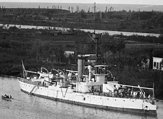 As designed, its main battery had two 240mm Krupp guns (one at the bow and the other at the stern) on Vavasseur mountings protected with armoured shields, and two quick-firing 120mm Elswick guns on each side. The secondary battery had four 47 mm quick-firing Nordenfelt/Hotchkiss guns, and two 25mm Nordenfelt guns.