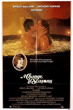 A Change of Seasons is a 1980 American comedy-drama film directed by Richard Lang. It stars Anthony Hopkins, Shirley MacLaine and Bo Derek. The film was a critical and commercial failure, grossing $7.2 million against its $6 million budget and receiving three nominations at the 1st Golden Raspberry Awards including Worst Actor (Hopkins) and Worst Screenplay.