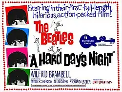 A Hard Day's Night is a 1964 musical comedy film starring the English rock band the Beatles – John Lennon, Paul McCartney, George Harrison and Ringo Starr – that was released during the height of Beatlemania. Directed by Richard Lester, it was written by Alun Owen and originally released by United Artists.[3] The musical soundtrack makes up the band's album of the same name. The film portrays 36 hours in the lives of the group as they prepare for a television performance.