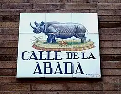 A street in Madrid, Calle de la Abada, close to the Puerta del Sol bears the name. Local legend has it that it was named after a sixteenth-century incident in the area in which a rhinoceros on display during a fair held on land owned by the San Martín Monastery killed a young boy and escaped to run through the city for several days before being caught. The prior of San Martin, Fray Pedro de Guevara, had a cross erected in memory of the boy. Years later, when the priory sold the land for houses to be built, a street was given the name Abada.[2]