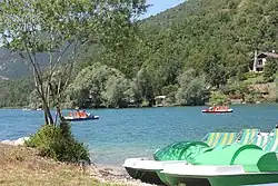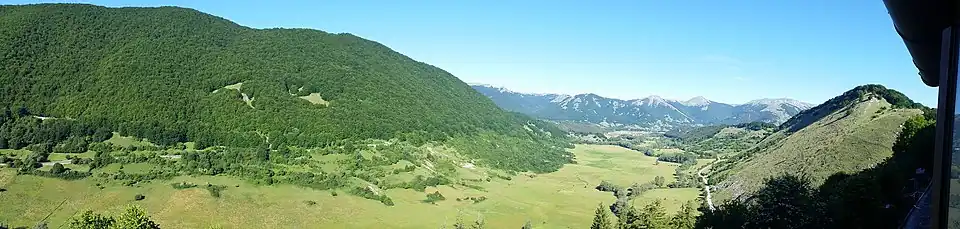 The mountains within the park are Petroso (2,249 metres), Marsicano (2,245 metres), Meta (2,242 metres), Tartaro (2,191 metres), Jamiccio (2,074 metres), Cavallo (2,039 metres), Palombo (2,013 metres).[5] These are included in the Monti della Meta. The Sangro River rises near Pescasseroli and runs south-east through the artificial Lago di Barrea before leaving the park and turning to the north-east. Other rivers in the park are the Giovenco, Malfa and Volturno. Other lakes are Vivo, Pantaniello, Scanno, Montagna Spaccata, Castel San Vincenzo, Grottacampanaro, and Selva di Cardito.