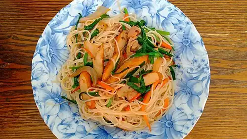 Abura-zōmen is a regional dish from Kyushu, made by stir-frying pork, vegetables, and sōmen noodles (そうめん). While it is similar to Okinawa's sōmen chanpuru (そうめんチャンプルー), a distinctive feature of Abura-zōmen in the Amami region is the addition of dashi broth during the stir-frying process. The emulsion of the stir-frying oil and the broth coats the noodles, giving them a smooth and pleasant texture.[1]