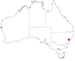 This species of wattle is endemic to an area in eastern New South Wales[3] where it has a restricted range around Howes Mountain and Mount Murwin areas and Yengo National Park area where it is commonly situated on hillslopes and ridges among and over sandstone bedrock or outcrops, or where areas of shale meet sandstones. It is found growing in sandy to sandy clay soils as a part of Eucalyptus woodlands or open forest communities as a part of the shrub understorey.[2][4][5]