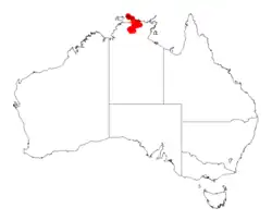 This species of wattle restricted to a small area in the top end of the Northern Territory along the Coburg Peninsula and the upper catchments of the Alligator and Liverpool Rivers where it is grows in gorges or on sandstone escarpments in skeletal sandy or deep sandy soils.[3][5] It is found in the Garig Gunak Barlu and Kakadu National Parks.[8]