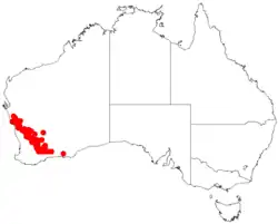 It is endemic to an area in the Mid West, Wheatbelt and Goldfields-Esperance regions of Western Australia where it is found on flats, sandplains and low rises growing in gravelly sandy soils around laterite.[2] The distribution is a belt that starts in the north from the catchment of the Murchison River to the east of Kalbarri that extends in a south easterly direct to around Newdegate[3] with more scattered populations as far south as Ravensthorpe.[2] It is often part of open scrub and shrubland communities.[3]