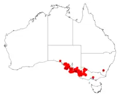 The species occurs naturally in shrubland and woodland in South Australia and Victoria.[2] It often occurs in association with Eucalyptus incrassata and Melaleuca uncinata.[3]