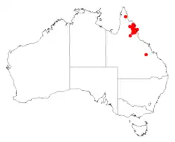 It is endemic to a small part of north eastern Queensland in the Cook District near Spring Creek approximately 40 km (25 mi) north west of Mount Carbine where it is usually situated on rocky ridges and disturbed areas growing in skeletal sandy soils as a part of Eucalyptus woodland communities.[2] The range of the shrub extends from west of Cooktown in the north extending down the western edge of the Great Dividing Range to near Mount Surprise covering a total area of around 29,150 km2 (11,250 sq mi).[3]