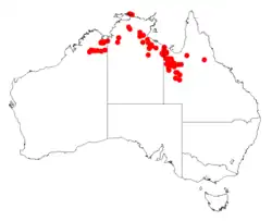 It has a scattered distribution across its range and is native to a small area in the Kimberley region of Western Australia where it is commonly found around sandstone to the north of Halls Creek.[1] It is also scattered across the top end of the Northern Territory and extends eastwards into north western parts of Queensland where it is often situated on stony hillsides and near creeks growing in gravelly soils as a part of Eucalyptus woodland communities where it is usually associated with species of Melaleuca.[2]