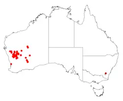 It is native to an area in the Mid West and Goldfields-Esperance regions of Western Australia where it is commonly situated along the margins of marshes and saline lakes and on flats growing in clay or loamy soils[1] as a part of open scrubland communities. It has a scattered distribution with the bulk of the population found between Twin Peaks, Cue, Perenjori and Youanmi with outlying populations found near Kalgoorlie.[2]