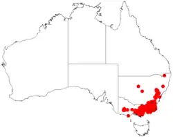 It is native south eastern New South Wales, the Australian Capital Territory,[3] and Victoria in eastern Australia. In New South Wales it is found in tableland areas of the Great Dividing Range that are south of the Goulburn River valley where it is found growing in soils derived from the surrounding sandstone as a part of moist or dry sclerophyll forest and woodland communities.[2] It is found in central and eastern Victoria where its range extends from the Grampians to areas east of Melbourne where it is commonly situated in montane woodlands and forests at an altitude of 500 to 1,700 m (1,600 to 5,600 ft).[3]