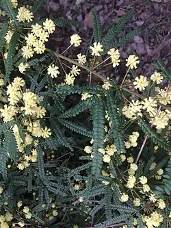 The slender willowy shrub or tree typically grows to a height of 2 to 5 metres (7 to 16 ft).[1] The slender erect habit forms a dense crown of evergreen foliage.[2] The branchlets are normally glabrous and ribbed.[3] The feather like phyllodes[2] are large made up of two to five pairs of pinnae with the larger being 25 to 80 millimetres (1.0 to 3.1 in) in length. The pinnae are made from 12 to 30 pairs of glabrous green pinnules that are only 3 to 6 mm (0.118 to 0.236 in) long and 1 to 2.5 mm (0.039 to 0.098 in) wide.[3] It blooms from July to December and produces cream-yellow flowers.[1] The flowers are supported in inflorescences that normally contain 15 to 25 flowers. It will later form seed pods that are around 60 mm (2.4 in) long and 3 to 4 mm (0.12 to 0.16 in) containing oblong seeds. The plants are sometimes known as cat bush from there offensive odour.[3]
