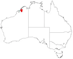 It is native to a small area in the west Kimberley region of Western Australia.[2] A few populations of the plant are known and are spread over a distance of about 100 km (62 mi) from around the Sale River, Synnott Range, Edkins Range and Mount Daglish where it is often situated between sandstone ridges growing in shallow sandy soils as a part of open low woodland communities where it is sparsely distributed.[1]