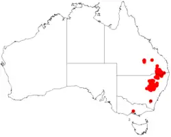 It is endemic from south eastern Queensland from the southern portion of the Darling Downs district and the range extends south to the central western slopes and north western plains of New South Wales as far south as Munghorn Gap Nature Reserve where it is found in a variety of habitat growing in infertile rocky, sandy or gravelly clay soils as a part of open Eucalyptus woodlands or in shrubland communities.[1]