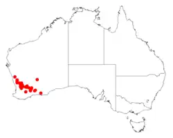 It is native to an area in the Wheatbelt region of Western Australia where it is commonly situated on undulating plains growing in gravelly sandy soils often over or around laterite[1] or loamy to clay soils. Its range extends from around Cadoux in the north to around Brookton in the south and as far east to around Lake King.[2]