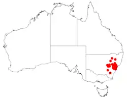 It is native to an area in New South Wales where it has a scattered distribution over the upper Blue Mountains from the north near Mount Monundilla to the south around the Megalong Valley and as far west as the Cox River extending to the east as far as the Watagan Range and Bucketty where it usually grows in gravelly sandy loam soils that have originated from sandstones.[1]