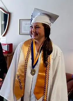 An academic stole is a vestment used by various organizations to denote club involvement or academic achievement. Its use includes membership of a professional organization,[1] a high school valedictorian award,[2] and adorns the academic regalia representing some university and college courses.