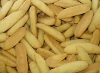Achiras or bizcochos de achira are traditional Colombian biscuits. They are made from achira flour (native to the region) instead of wheat flour. Widely recognized in Huila as the achiras del Huila or bizcochos de achira, they provide minerals such as calcium, iron, phosphorus, sodium and high protein content and are gluten-free. Its shape is elongated and cylindrical with a golden yellow colour, typical of good cooking. It melts slightly in your mouth with a crispy, soft and gritty texture, with a taste of milk.The achira is also known as saga or chisgua in Colombia. They are consumed as food by the Chibchas in Colombia, but it is thought that their use has extended throughout the Andes due to commercial exchanges with other indigenous communities.[1]