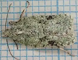 Thorax with strong posterior crest. Forewings oblong, pale green, sometimes mixed or strigulated with grey; tufts numerous; usually some irregular scattered black marks; sometimes with ochreous spots or suffusions in disc, or suffused blackish spots. Hindwings grey, darker towards apex. It is a variable species and many different forms have been described, but all have a combination of blackish and whitish markings on a pale green ground.[2] [3] Julius von Kennel provides a full description.[4]