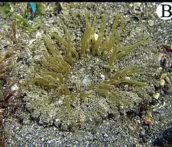 The foot of the column is usually attached to a hard substrate, a rock, a shell or a sea grass rhizome, while the oral disc lies flat on the sediment surface. During the day, the tentacles are contracted and the collar expands so that the zooxanthellae receive the maximum amount of sunlight for photosynthesis; the greenish-brown colour of the collar resembles scraps of dead seagrass and may provide camouflage. At night, the tentacles are extended to catch plankton and organic particles, and the collar contracts.[3] At the slightest disturbance, the whole column contracts and the sea anemone disappears beneath the sediment. It has been found that two types of faecal pellets are emitted through the mouth; one type contains the normal end-products of digestion, but the other contains zooxanthellae debris covered with mucus, which continue to be produced even when the animal is starved of planktonic food. This suggests that the mainstay of the sea anemone's diet may be the digestion of the zooxanthellae found in its tissues.[2]