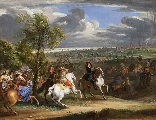 Adam Frans van der Meulen was born in Brussels where he was baptized on 11 January 1632.[7] He was the eldest of the seven children of Pieter van der Meulen and his second wife Maria van Steenwegen.[3] His father was a respected notary.[6] He was registered on 5 March 1651 at the Brussels Guild of Saint Luke as the pupil of Peter Snayers. Snayers was a painter from Antwerp who had moved to Brussels to work for the court. He specialized in pictures of battles, attacks on convoys and civilians and hunting scenes.[7] Van der Meulen became a master of the Guild of Saint Luke in Brussels on 5 March 1651.