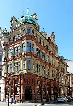 The Adelphi Bank Building is a 19th-century Grade II* listed former bank located on Castle Street in Liverpool, England. The architect was William Douglas Caröe and the building was completed in 1892 for the now defunct Adelphi Bank the building's architecture has been described as a mixture of French European Renaissance with Nordic and Eastern European themes.[1][2] At present, the ground floor is a branch of the Caffè Nero coffee house.[3]