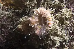 In British waters, where it is at the northern limit of its range, Adna anglica is found in association with the solitary cup coral Caryophyllia smithii,[3] and in the Mediterranean it is often associated with the sunset cup coral (Leptopsammia pruvoti).[4] However, it has been found growing on corals of at least eight different genera.[3]