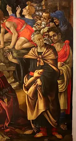 Filippino Lippi followed Leonardo's setting, in particular in the central part of the work. Much of its inspiration was clearly derived from Botticelli's Adoration of the Magi, also in the Uffizi: this is evident in the disposition of the characters on the two sides, with the Holy Family portrayed in the centre under. Similarly to Botticelli's work, Filippino also portrayed numerous members of the Medici cadet line, who had adhered to the Savonarolian Republic in the period in which the work was executed. On the left, kneeling in a luxurious, fur-lined yellow robe and holding an astrolabe, is Pierfrancesco de' Medici, who had died 20 years before.[1][2][3] Behind him, standing, are his two sons Giovanni, holding a goblet, and Lorenzo, from whom a page is removing a crown.