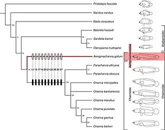 3. ^ a b c Britz, Ralf; Dahanukar, Neelesh; Anoop, V. K.; Philip, Siby; Clark, Brett; Raghavan, Rajeev; Rüber, Lukas (30 September 2020). "Aenigmachannidae, a new family of snakehead fishes (Teleostei: Channoidei) from subterranean waters of South India". Scientific Reports. 10 (1): 16081. Bibcode:2020NatSR..1016081B. doi:10.1038/s41598-020-73129-6. ISSN 2045-2322. PMC 7527459. PMID 32999397.