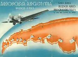 Aeroposta Argentina remained Argentina's only airline until 1946, when several new ones were created.[3] In 1949 Aeroposta Argentina merged with three other air carriers, ALFA (Sociedad Mixta Aviación del Litoral Fluvial Argentino), FAMA (Flota Aerea Mercante Argentina) and ZONDA (Zonas Oeste y Norte de Aerolíneas Argentinas), giving rise to the county's new national airline, Aerolíneas Argentinas.[4]