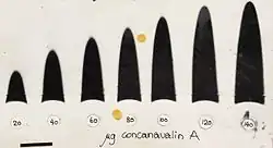 Affinity electrophoresis is a general name for many analytical methods used in biochemistry and biotechnology. Both qualitative and quantitative information may be obtained through affinity electrophoresis.[1] Cross electrophoresis, the first affinity electrophoresis method, was created by Nakamura et al. Enzyme-substrate complexes have been detected using cross electrophoresis.[2][3][4][5][6] The methods include the so-called electrophoretic mobility shift assay, charge shift electrophoresis and affinity capillary electrophoresis.[1] The methods are based on changes in the electrophoretic pattern of molecules (mainly macromolecules) through biospecific interaction or complex formation. The interaction or binding of a molecule, charged or uncharged, will normally change the electrophoretic properties of a molecule.[7][1] Membrane proteins may be identified by a shift in mobility induced by a charged detergent. Nucleic acids or nucleic acid fragments may be characterized by their affinity to other molecules. The methods have been used for estimation of binding constants, as for instance in lectin affinity electrophoresis or characterization of molecules with specific features like glycan content or ligand binding.[1] For enzymes and other ligand-binding proteins, one-dimensional electrophoresis similar to counter electrophoresis or to "rocket immunoelectrophoresis", affinity electrophoresis may be used as an alternative quantification of the protein.[8] Some of the methods are similar to affinity chromatography by use of immobilized ligands.