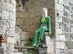 Nothing is known of de Courcy's early life. He arrived in Ireland in 1176, with Henry's deputy in Ireland, William fitz Audelin (d. before 1198), and was a member of the English garrison of Dublin.[12] According to the Gerald, de Courcy led an invasion of Ulaid in 1177 (an area roughly encompassing what is today County Antrim and County Down). He reached Down (modern day Downpatrick), drove off Ruaidrí Mac Duinn Sléibe, King of Ulaid (d. 1201),[13] and consolidated his conquest of the area with the erection of a castle.[14] He thereafter ruled his lands with a certain amount of independence for about a quarter of a century.[15] According to the Dublin Annals of Inisfallen, the marriage between Affreca and de Courcy took place in 1180. Although scholars consider these annals particularly unreliable,[16] a date of about 1180 may not be far off the mark, considering the time-frame of de Courcy's rapid rise to power.[17] It is possible that de Courcy's marriage could have attributed to his success in Ulaid, considering the military resources of the Crovan dynasty. Less speculative is the likelihood that de Courcy's success was used by the Crovan dynasty, who were allied by marriage with Cenél nEógain, as a means of settling old scores.[18]