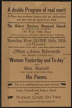The Unitarian Reverend Brown arrived in Harlem from Jamaica in 1920, where he was introduced to a number of intellectual and political radicals of the time including Claude McKay and Frank Crosswaith, and indoctrinated into socialist ideology. By 1928, Brown was the Reverend of his own church, the Hubert Harrison Memorial Church, where he gave religious sermons and advocated for socialist ideals.[7] Brown believed that socialism was a logical socio-political ideology to represent his religious philosophy, and the ideals of socialism shared the same interests of African-American and Afro-Caribbean peoples to attain economic and labor equality.[7] Brown was hired by the Socialist Party of America as a speaker and the Christian socialist publication World of Tomorrow as the office secretary.[7]