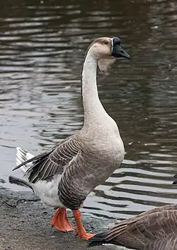 The African or African Goose is a breed of domestic goose. It is one of two domestic breeds that derive from the wild species Anser cygnoides, the other being the Chinese; all other domestic geese derive from Anser anser. Despite the name, it is not from Africa but is of Chinese origin, found in Teochew and Swatow of South China.[8] It is a large bird, among the heaviest of all goose breeds.