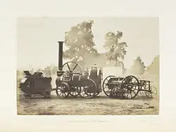 Mid 19th century the portable steam-powered plowing engines were introduced. They were used in pairs, placed on either side of a field to haul a plow back and forth between them using a wire cable. These portable engines were also used to power threshing machines, mills and pumps.[1] The portable steam engines were produced by specific agricultural machinery maker, such as Ransomes, Sims & Jefferies who had started as brass and iron-founder making casting ploughshares late 18th century.
