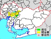 * yellow - areas formerly within the district borders during the early Meiji period