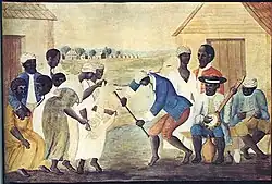 The Old Plantation, ca. 1785–1795. Late 18th-century watercolour showing enslaved people dancing, with a banjo and drum, on a South Carolina plantation.