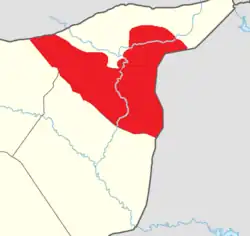 Al-Barakah Province generally claimed all of al-Hasakah Governorate as its territory, though it never fully controlled the region.[3][4][6][22] By early 2016, al-Barakah Province's headquarters was al-Shaddadah, while the province had been reduced to southern al-Hasakah Governorate.[1] Following its demotion to district and move south, the administrative division covered Hajin[b] and the villages of al-Baghuz Fawqani, al-Sayyal and Hasrat (which IS calls al-Khayrat) and Mawzan near the Euphrates, all of them part of the Abu Kamal District. Furthermore, the village of al-Bahra near Hajin was already part of al-Barakah since late 2017. Al-Barakah district in its current form is bordered by al-Furat district to its west and al-Khayr district to its northwest.[3][14]